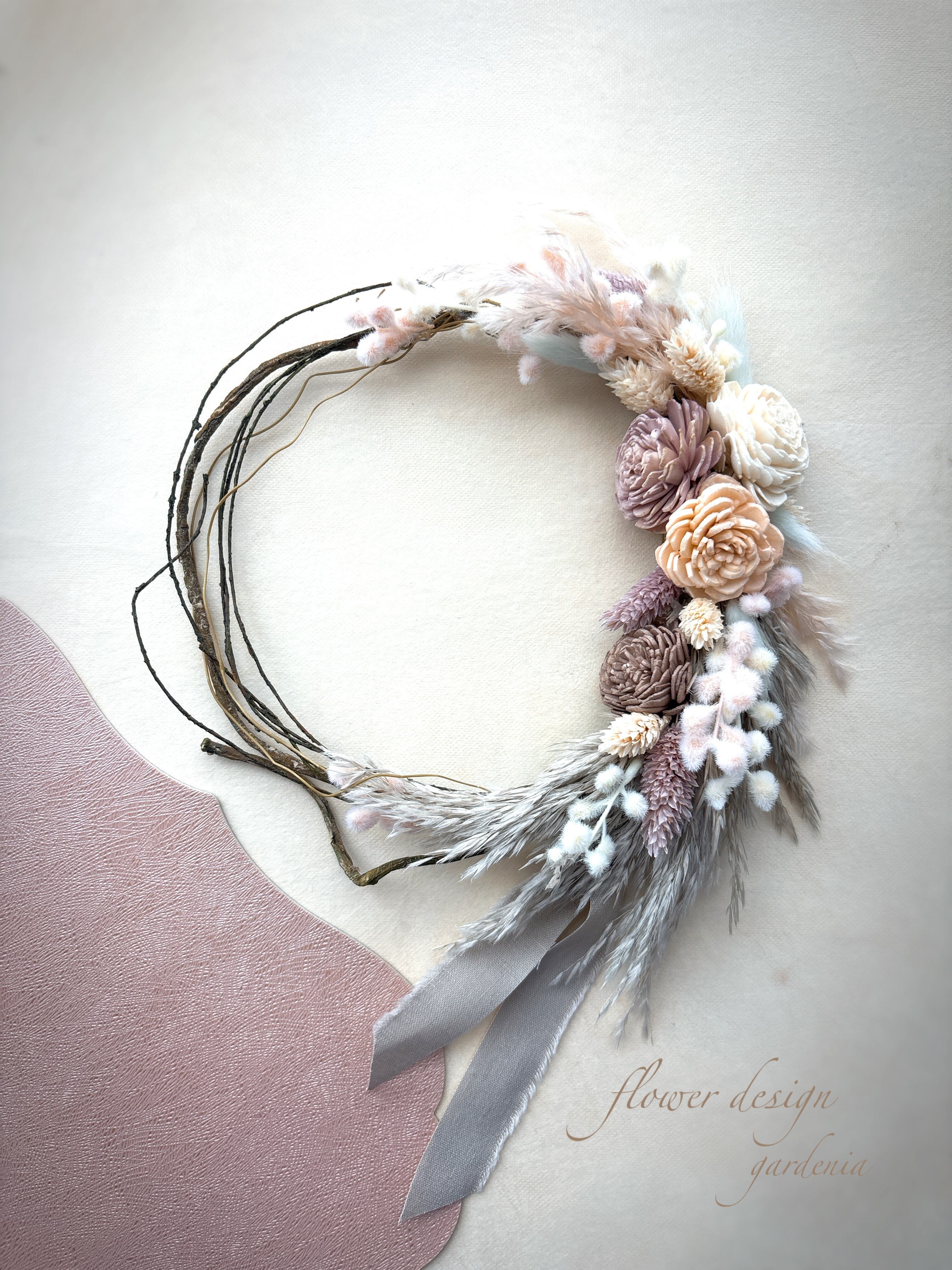 サイズ 約W20cm H28cm 使用花材 ドライフラワー、アーティフィシャルフラワー ソラフラワーなど使用したリース ポイントにミモザのホワイト、ピンクが 入っていて大人フェミニンカラーです。